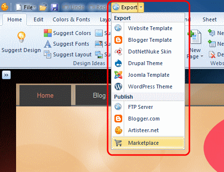 Note: The Weebly export plugin is not included in Artisteer 4.0 by default. Please install it (for free) from Artisteer Marketplace. Navigate Export -> Marketplace -> New -> Weebly to install the plugin.